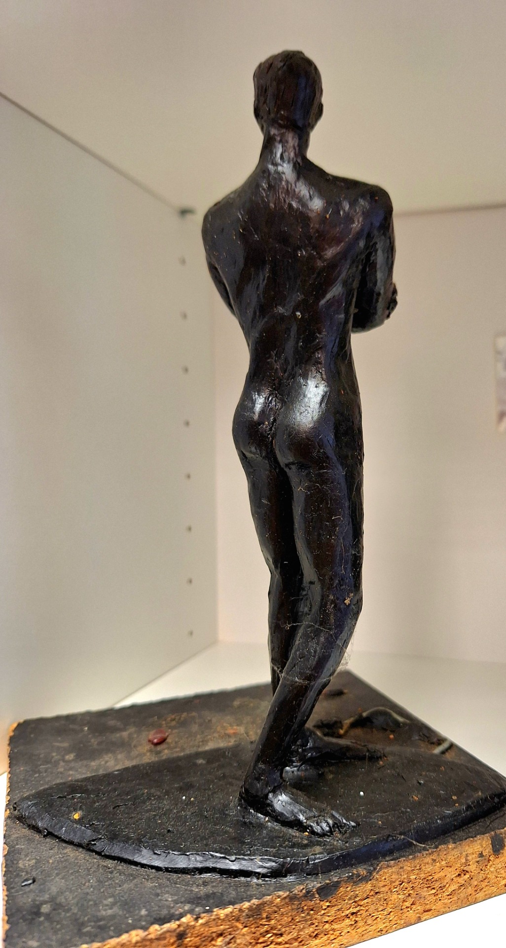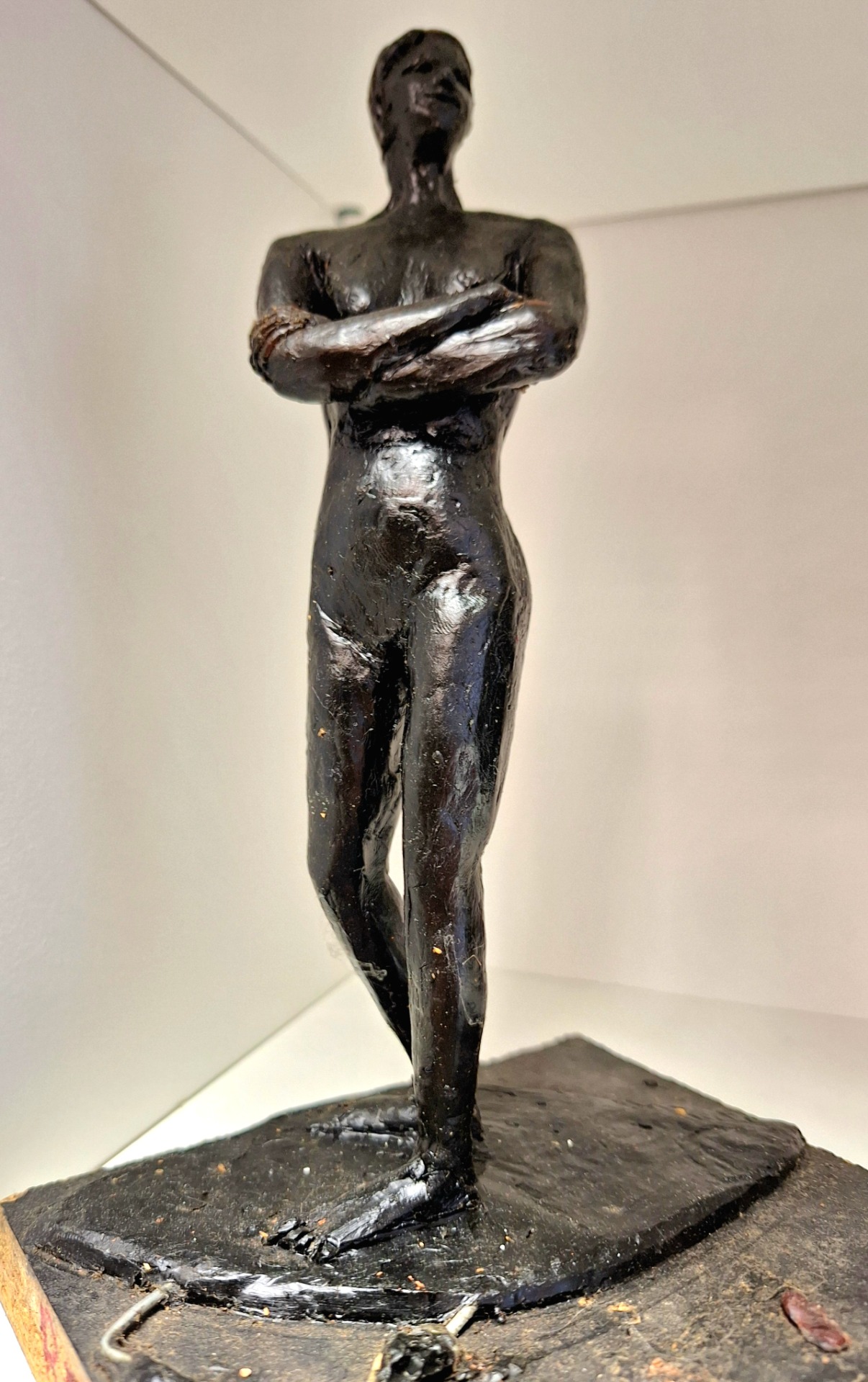 Steeds dezelfde dame in driemaal zittend in Keramiek en tweemaal staand in was: te bestellen in hars of brons.